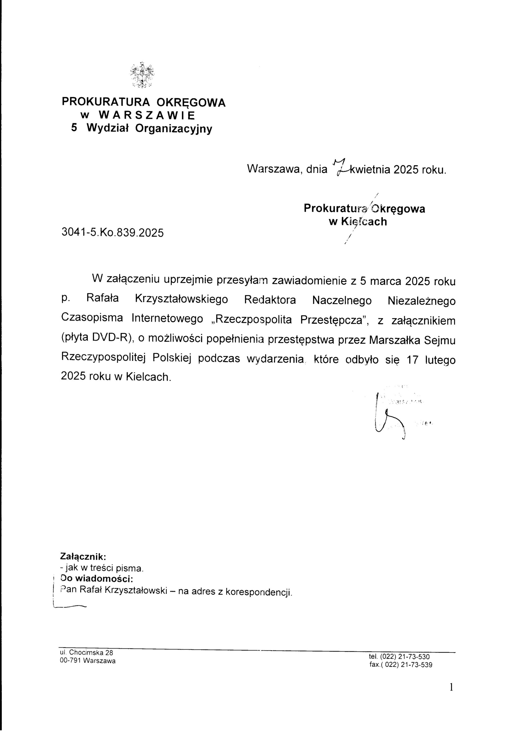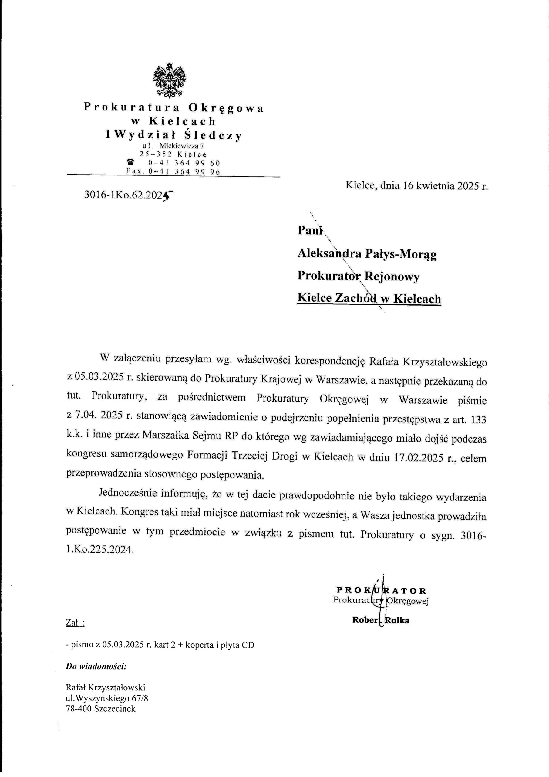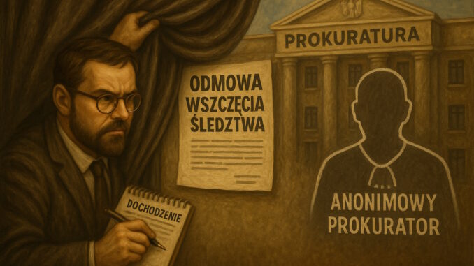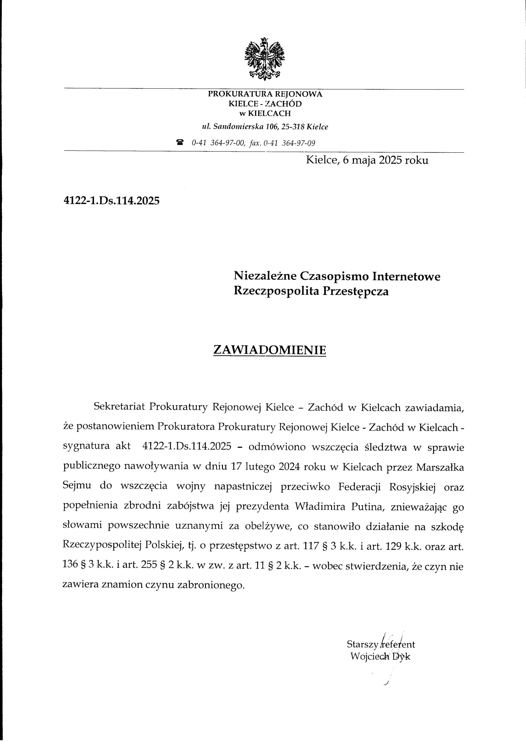 Co więcej – pismo z Prokuratury Rejonowej w Kielcach, informujące o odmowie wszczęcia śledztwa, nie zawiera nawet nazwiska i funkcji prokuratora, który podjął decyzję. Pod dokumentem widnieje jedynie podpis „starszego referenta” Wojciecha Dyka, który w praktyce nie ponosi żadnej odpowiedzialności merytorycznej – jedynie przekazuje cudze rozstrzygnięcie. To groteskowy symbol bezosobowej biurokracji, w której nikt nie bierze odpowiedzialności, a obywatel pozostaje z pytaniem bez adresata: kto dokładnie zignorował prawo i na jakiej podstawie?