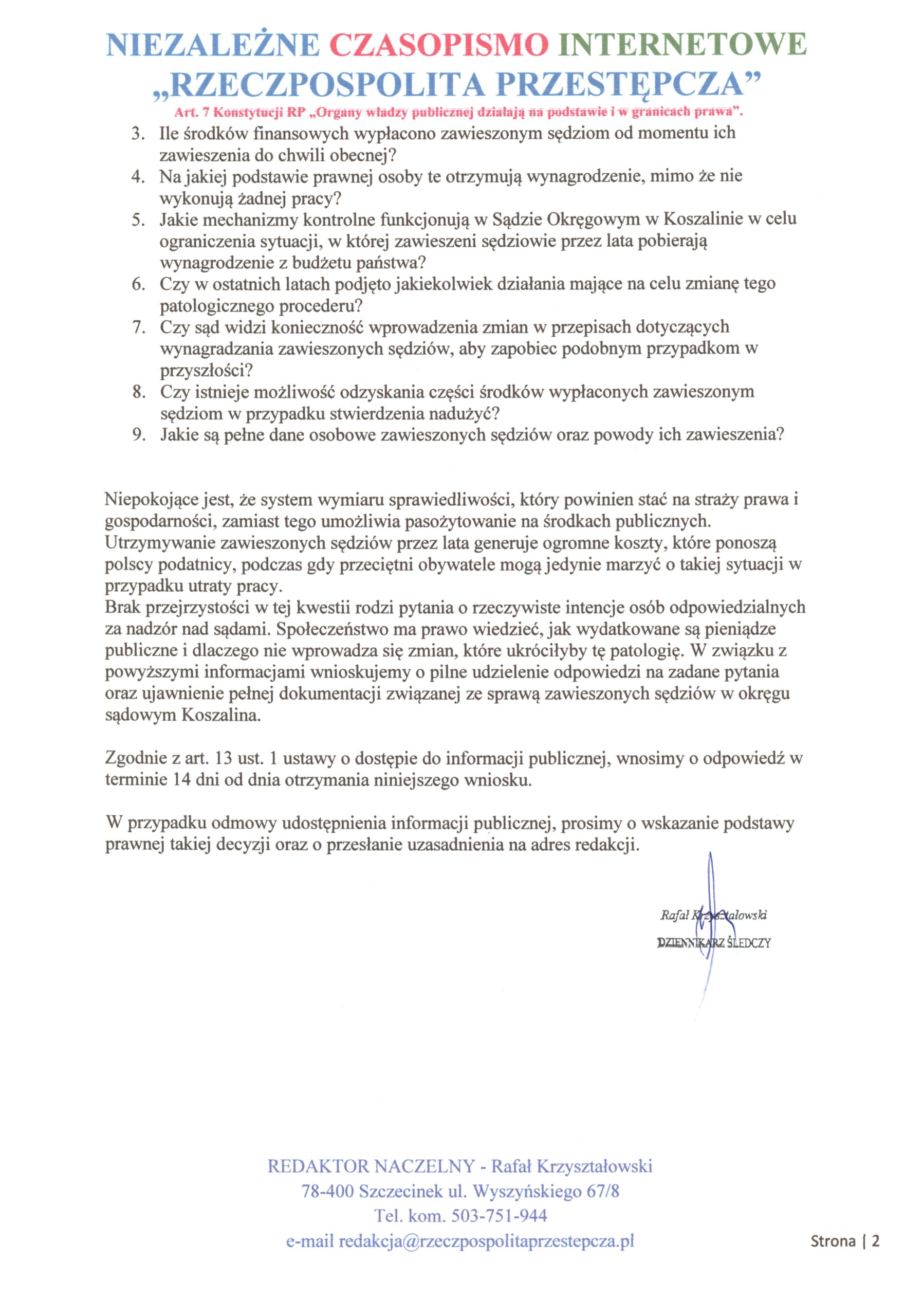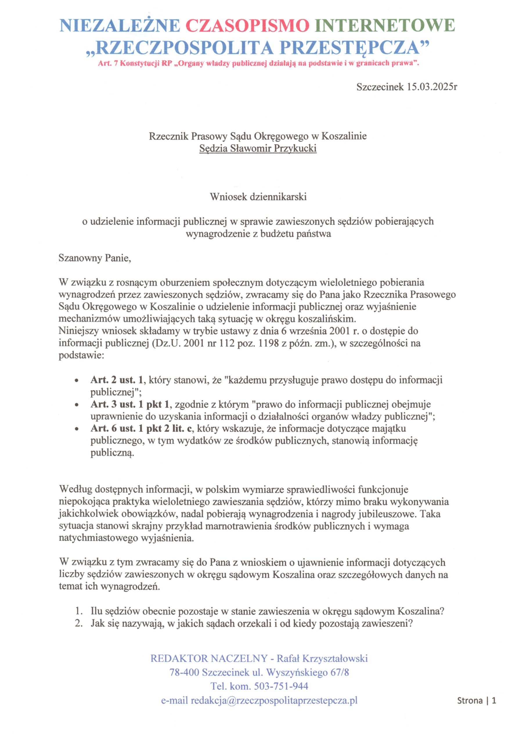 Redakcja NCI Rzeczpospolita Przestępcza postanowiła wziąć sprawy w swoje ręce i zmusić władze do ujawnienia skali tego skandalu. Dlatego skierowaliśmy oficjalny wniosek dziennikarski do Rzecznika Prasowego Sądu Okręgowego w Koszalinie, Sędziego Sławomira Przykuckiego, zobowiązując go do podania szczegółowych informacji o zawieszonych sędziach i kosztach, jakie ich „płatne wakacje” generują dla budżetu państwa.