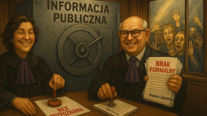 Podczas gdy wszystkie inne sądy i prokuratury bez wahania udzieliły informacji zgodnie z obowiązującym prawem, Sąd Okręgowy w Warszawie – pod rządami prezes Beaty Najjar i jej zastępcy, sędziego Huberta Zaremby – postanowił postawić mur biurokratycznej pogardy wobec obywatela. Zamiast odpowiedzi: cisza. Zamiast jawności: ogólniki. Zamiast szacunku dla konstytucji: demonstracyjne odwrócenie się plecami.