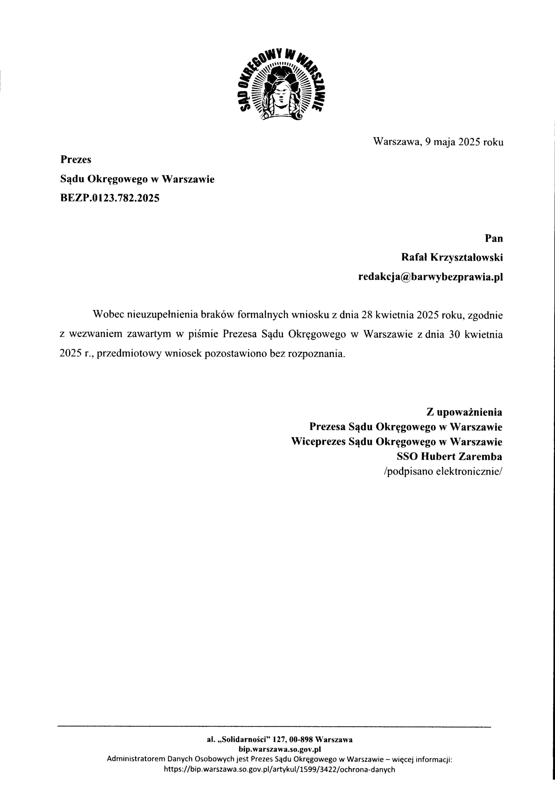 W odpowiedzi na pismo z dnia 9 maja 2025 r., podpisane przez Wiceprezesa Sądu Okręgowego w Warszawie SSO Huberta Zarembę, informujące o rzekomym pozostawieniu bez rozpoznania mojego wniosku z dnia 28 kwietnia 2025 r., uprzejmie oświadczam, co następuje: