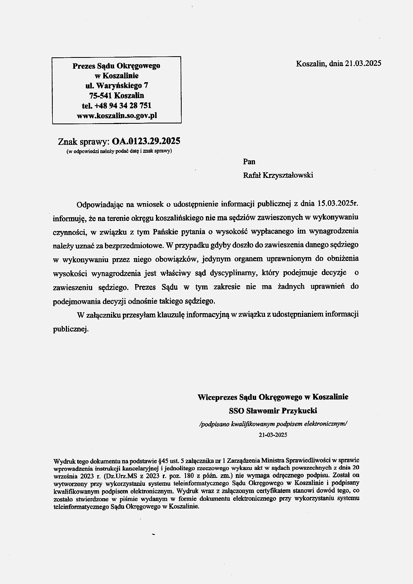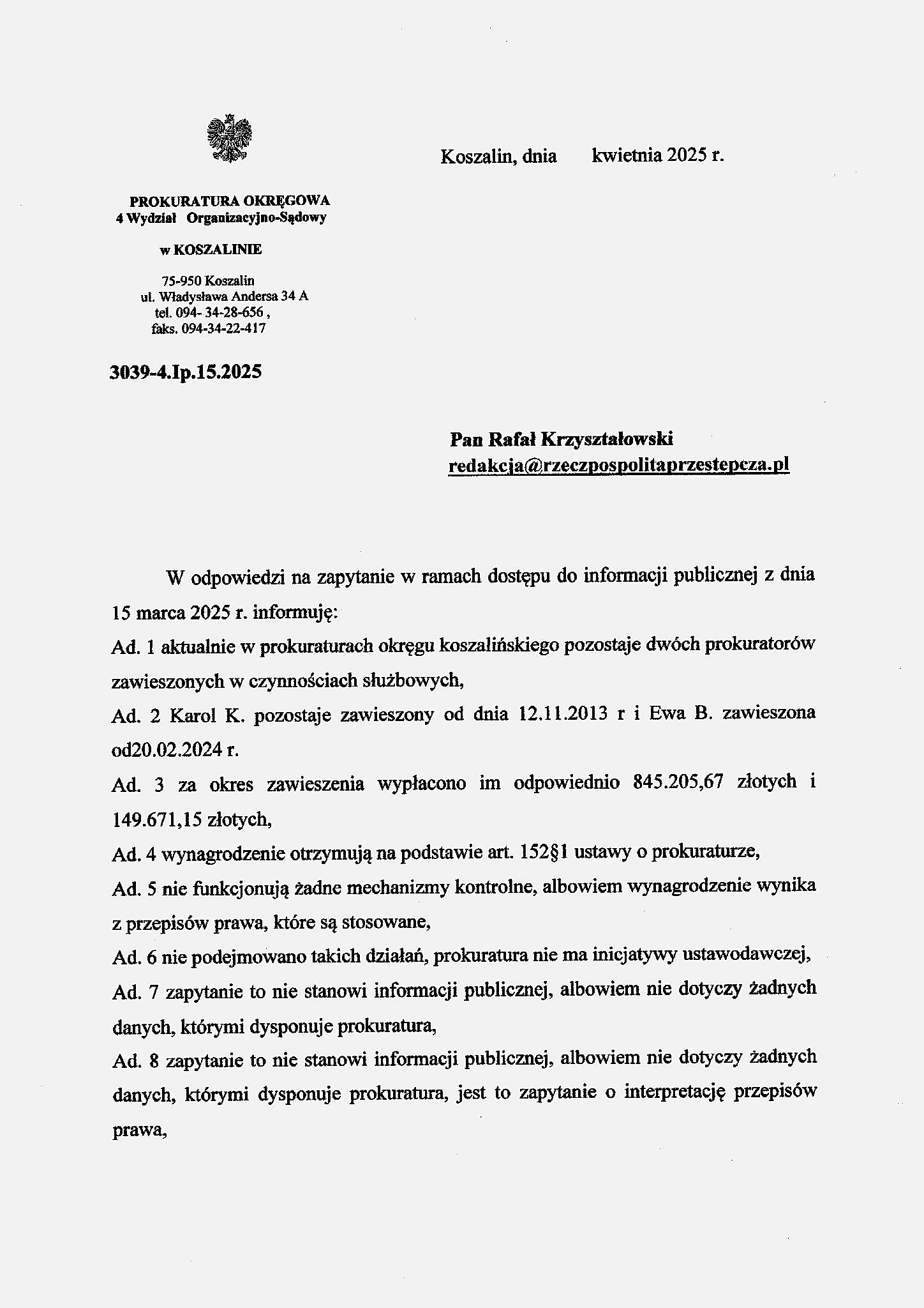 W obliczu narastającego społecznego oburzenia, redakcja „Rzeczpospolitej Przestępczej” postanowiła wziąć pod lupę jeden z najbardziej bulwersujących aspektów działania wymiaru sprawiedliwości – wieloletnie, sowicie opłacane zawieszenia sędziów i prokuratorów. Efekt? Mur milczenia, umywanie rąk i urzędnicze „nie dotyczy”, „nie wiemy”, „nie musimy”. System nie tylko nie działa – on nie chce działać. Prokuratura: „Nic nie możemy, nic nie zrobimy” Z pisma prokurator Ewy Dziadczyk jasno wynika: w Koszalinie zawieszeni od lat prokuratorzy – Karol K. (od 2013) i Ewa B. (od 2024) – bez wykonywania jakichkolwiek obowiązków zgarnęli niemal milion złotych. I co na to prokuratura? Rozkłada ręce. Nie ma mechanizmów, nie podejmuje działań, nie widzi problemu. Prawo – według nich – nie wymaga, więc oni się nie ruszą. Co gorsza, zapytana o sprawę prokuratora Wiesława M., który – według naszych ustaleń – miał być zawieszony od 19 lat, odpowiedziała: „Nie wiem, kim jest prokurator Wiesław M.” Serio? Przypadek, który uruchomił całą interwencję dziennikarską, spotyka się z bezczelnym „nie wiem”? To już nie tylko ignorancja. To sabotaż zaufania publicznego. Sąd: „Tematu nie ma, bo dziś nie ma zawieszonych” Odpowiedź sędziego Sławomira Przykuckiego to szczyt formalistycznej arogancji. Na pytanie o mechanizmy kontroli odpowiedział: „Nie mamy obecnie zawieszonych sędziów, więc pytania są bezprzedmiotowe”. Jakby cały problem znikał z chwilą, gdy nie ma go akurat w danym dniu w statystykach. Żadnej refleksji, żadnej troski o pieniądze publiczne. Zero odniesienia do potrzeby reform. Tylko biurokratyczne zasłony dymne. Bo przecież wygodniej nic nie widzieć, nic nie słyszeć i trzymać się kurczowo literalnego brzmienia przepisów. Pytania uznane za „niewygodne” – instytucje chowają głowy w piasek. Gdy próbowaliśmy uzyskać odpowiedzi na pytania o kontrolę, nazwiska, propozycje reform czy sposoby odzyskania pieniędzy – usłyszeliśmy, że to „nie jest informacja publiczna”. Tłumaczenie? Jawność kończy się tam, gdzie zaczyna się odpowiedzialność. Społeczeństwo nie ma dziś żadnej realnej kontroli nad tym, jak sądy i prokuratury rozdają publiczne pieniądze osobom zawieszonym. Zamiast sankcji – przywileje. Zamiast dyscypliny – bezkarność. Państwo w państwie – wygodne zawieszenie, tłuste przelewy. Z każdą odpowiedzią z Koszalina coraz bardziej klaruje się obraz instytucjonalnej obojętności. Nikt nic nie może. Nikt nic nie musi. A przede wszystkim – nikt niczego nie chce zmieniać. Przez lata funkcjonuje układ, w którym zawieszenie to nie kara, a nagroda – urlop z pełnym wynagrodzeniem, czasem przez dekady. Przeciętny obywatel za zawieszenie w pracy traci wszystko. Tu – zawieszony funkcjonariusz dostaje pensję, przywileje i pełną ochronę systemu. To nie jest tylko nieuczciwe. To jest chory system, który sam siebie nie zamierza leczyć. Czas przerwać milczenie – dość pasożytowania na państwie. Wzywamy Ministerstwo Sprawiedliwości oraz Najwyższą Izbę Kontroli: zacznijcie działać. Sprawdźcie, kto, kiedy, na jakiej podstawie i za ile lat niepracowania pobierał środki publiczne. Wprowadźcie realne mechanizmy kontroli i jawności. Bo jeśli ci, którzy mają stać na straży prawa, sami ukrywają nadużycia – to kto nas ma chronić? Nie możemy dłużej akceptować sytuacji, w której zawieszenie staje się złotym etatem, a milczenie – systemową normą.