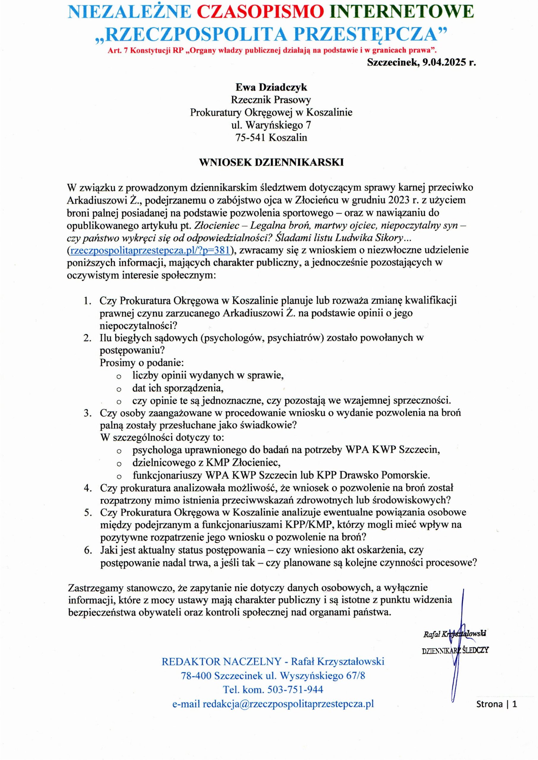 Redakcja „Rzeczpospolita Przestępcza” wystąpiła z formalnym wnioskiem dziennikarskim do Rzeczniczki Prokuratury Okręgowej w Koszalinie, Ewy Dziadczyk, żądając niezwłocznego ujawnienia kluczowych informacji dotyczących postępowania. Wniosek został przekazany drogą elektroniczną w dniu 9 kwietnia 2025 r. i dotyczy m.in. liczby powołanych biegłych, ich opinii, statusu postępowania oraz potencjalnych powiązań służbowych między podejrzanym a przedstawicielami organów, które opiniowały jego wniosek o pozwolenie na broń.
